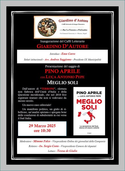 Questa mattina, in via #Cannavino 6, il Caffè Letterario ha aperto le sue porte grazie alla visione e all’impegno di Enzo Carro, Teresa De Giulio, Enzo Nugnes e Grazia Vernillo. L’evento inaugurale ha visto la presenza di un ospite d’eccezione: lo scrittore e giornalista Pino Aprile, che ha presentato il suo ultimo libro “#Meglio#Soli“. Un incontro che ha segnato il battesimo di un luogo destinato a diventare un punto di riferimento per la crescita culturale e sociale del territorio.