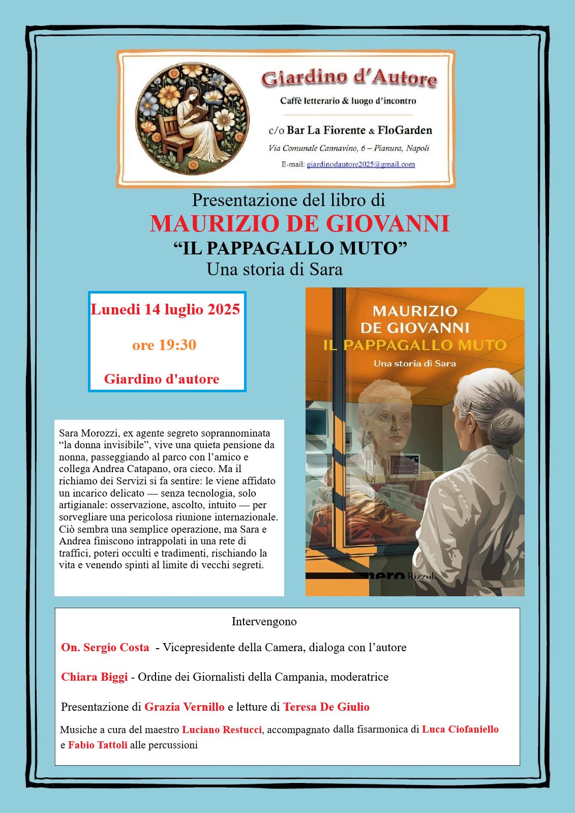 Il 14 luglio, nel cuore del Giardino dell’Arte e della Cultura di Pianura, avrò l’onore di raccontare l’ultimo lavoro editoriale di Maurizio De Giovanni, scrittore di popolo e di anime. L’incontro sarà condotto dalla giornalista Chiara Biggi, mente e voce dell’Ufficio Stampa Anas per Campania e Basilicata, che in questa occasione torna al suo primo amore: la parola detta e condivisa.
