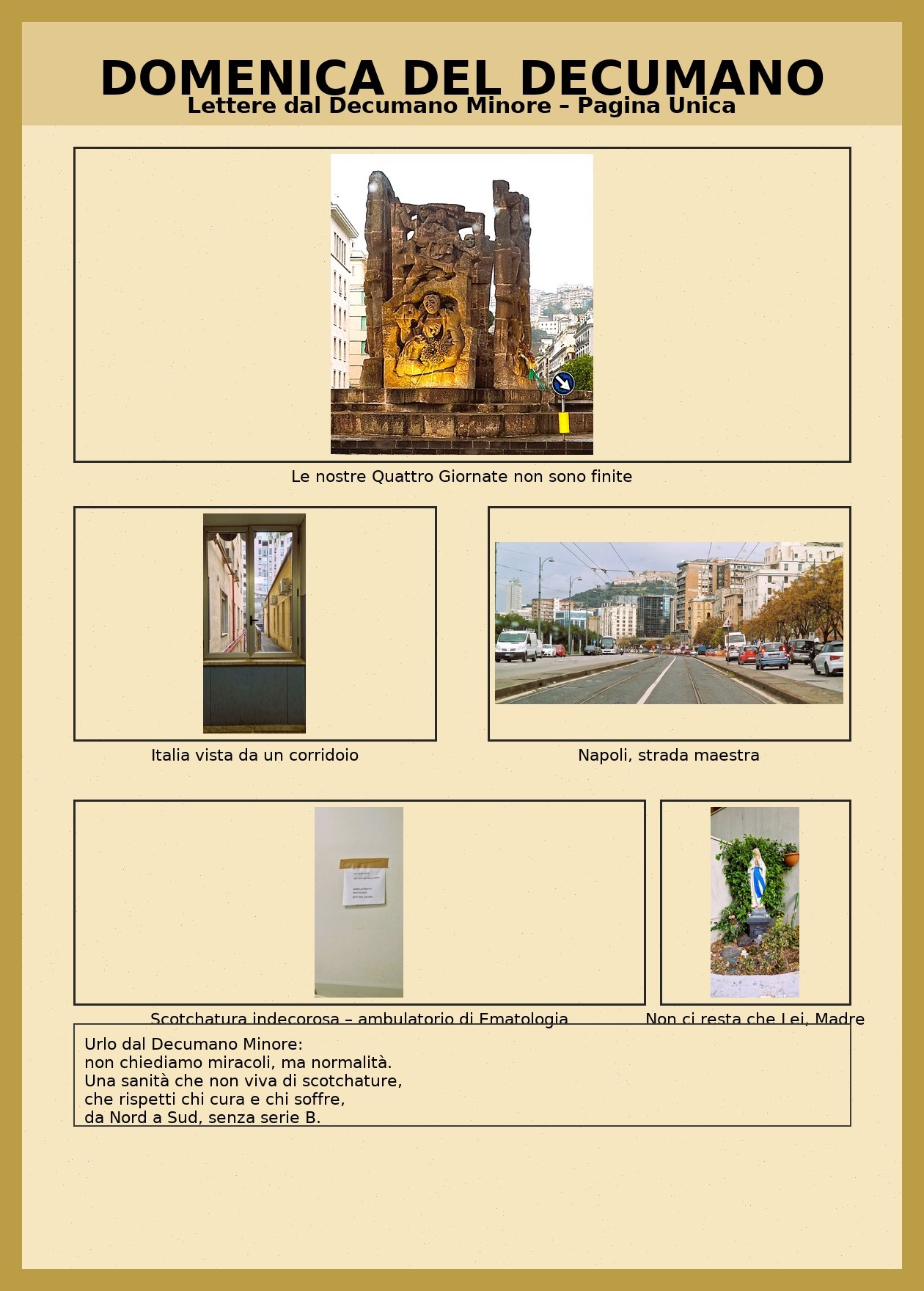 Oggi non ci sono carri #armati nelle strade, ma ci sono altre occupazioni: liste d’attesa che sembrano reticolati, reparti appesi con lo #scotch, corridoi dove si marcia avanti e indietro in fila per una visita. E allora le mie “quattro giornate di Napoli” sono queste: quelle viste da un #giornalista di strada diversamente malato, con in mano una macchina fotografica e un foglio #A4#scotchatato sulla porta di un ambulatorio di #Ematologia, a raccontare che il Sud non è un’invenzione folkloristica, ma un fronte vero, oggi, qui.