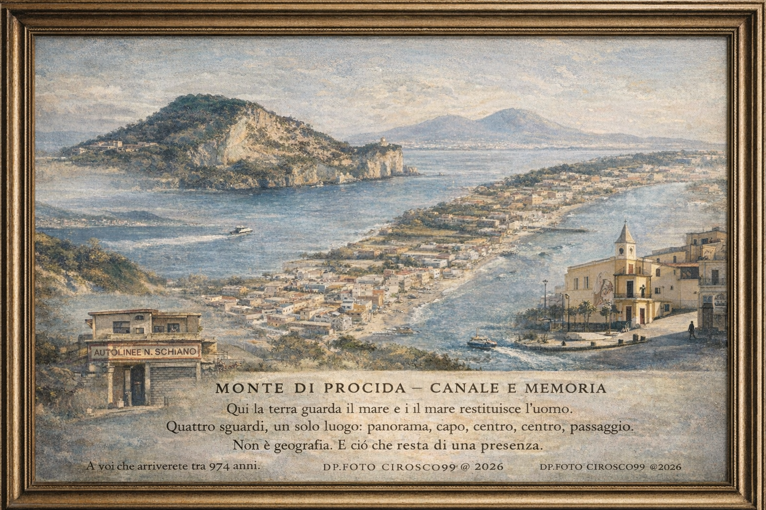 Il fondo è la panoramica: lo sguardo alto, quello che abbraccia Monte di Procida, il canale e l’isola. È la geografia apparente, ciò che tutti vedono.