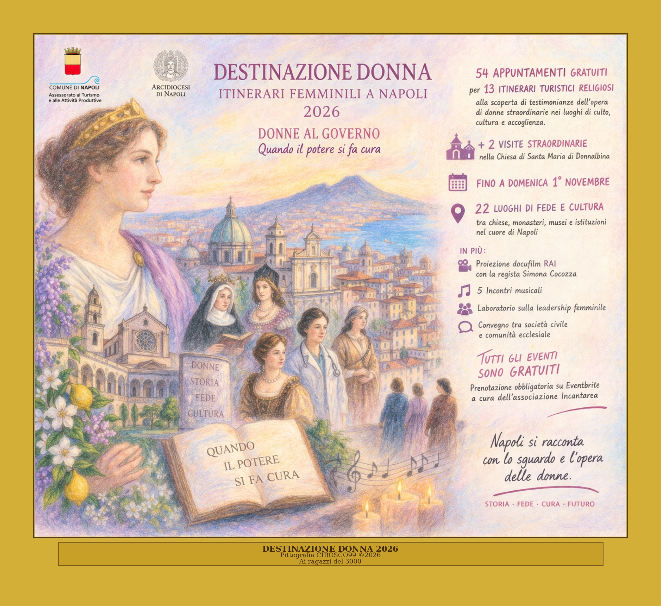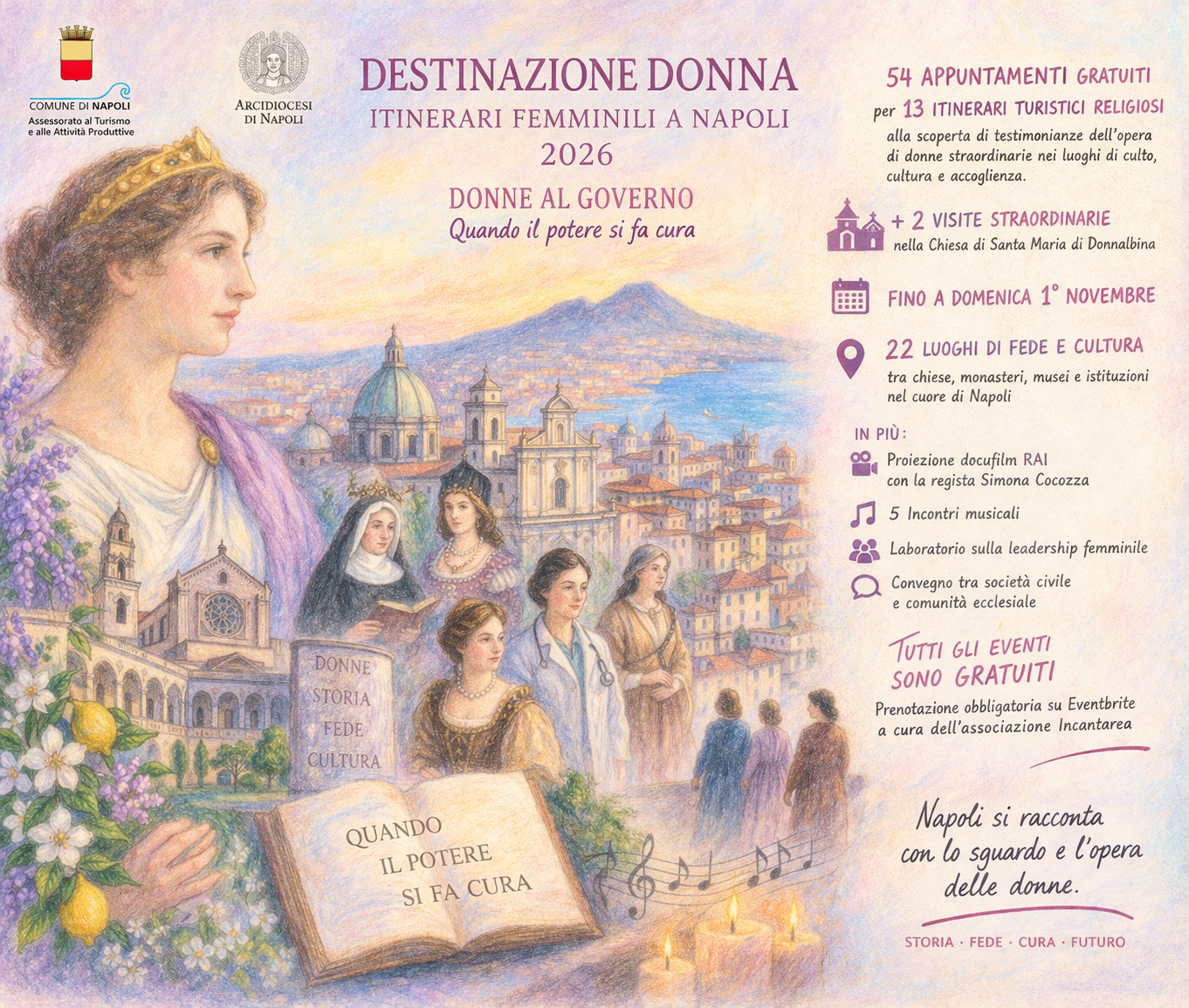 Promosso dall’Assessorato al Turismo e alle Attività Produttive del Comune di Napoli e realizzato in collaborazione con l’Arcidiocesi di Napoli, il progetto accompagnerà cittadini e visitatori fino al 1° novembre dentro una città meno visibile, ma più profonda: quella costruita, abitata e trasformata dalle donne.