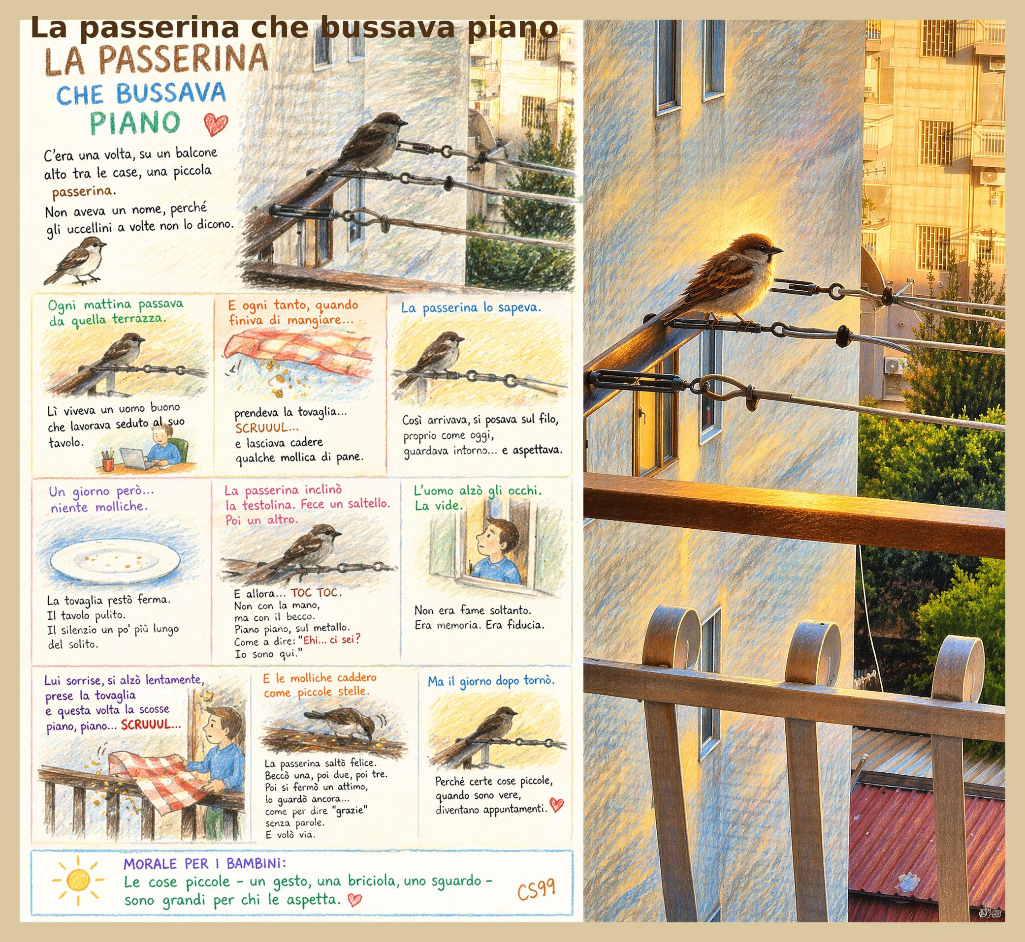 Un giorno però le molliche non cadono. Il balcone resta fermo, il tempo sembra sospeso. La passera non vola via. Resta. Osserva. Poi “bussa” piano, con il becco, come a ricordare la sua presenza.
