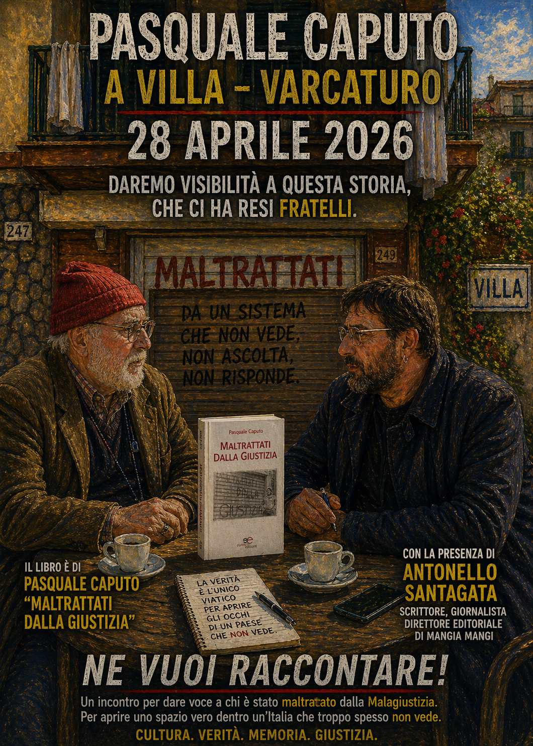 Non è una semplice presenza, non è un invito culturale come tanti. A Villa, a Varcaturo, il prossimo 28 aprile 2026 accade qualcosa che ha il peso delle storie vere: Pasquale Caputo sarà chiamato a essere giudice. Non soltanto di un evento o di una rassegna, ma di un racconto collettivo che affonda nella vita vissuta, nella ferita aperta della malagiustizia e nella necessità, oggi più che mai, di restituire parola a chi è stato ridotto al silenzio.